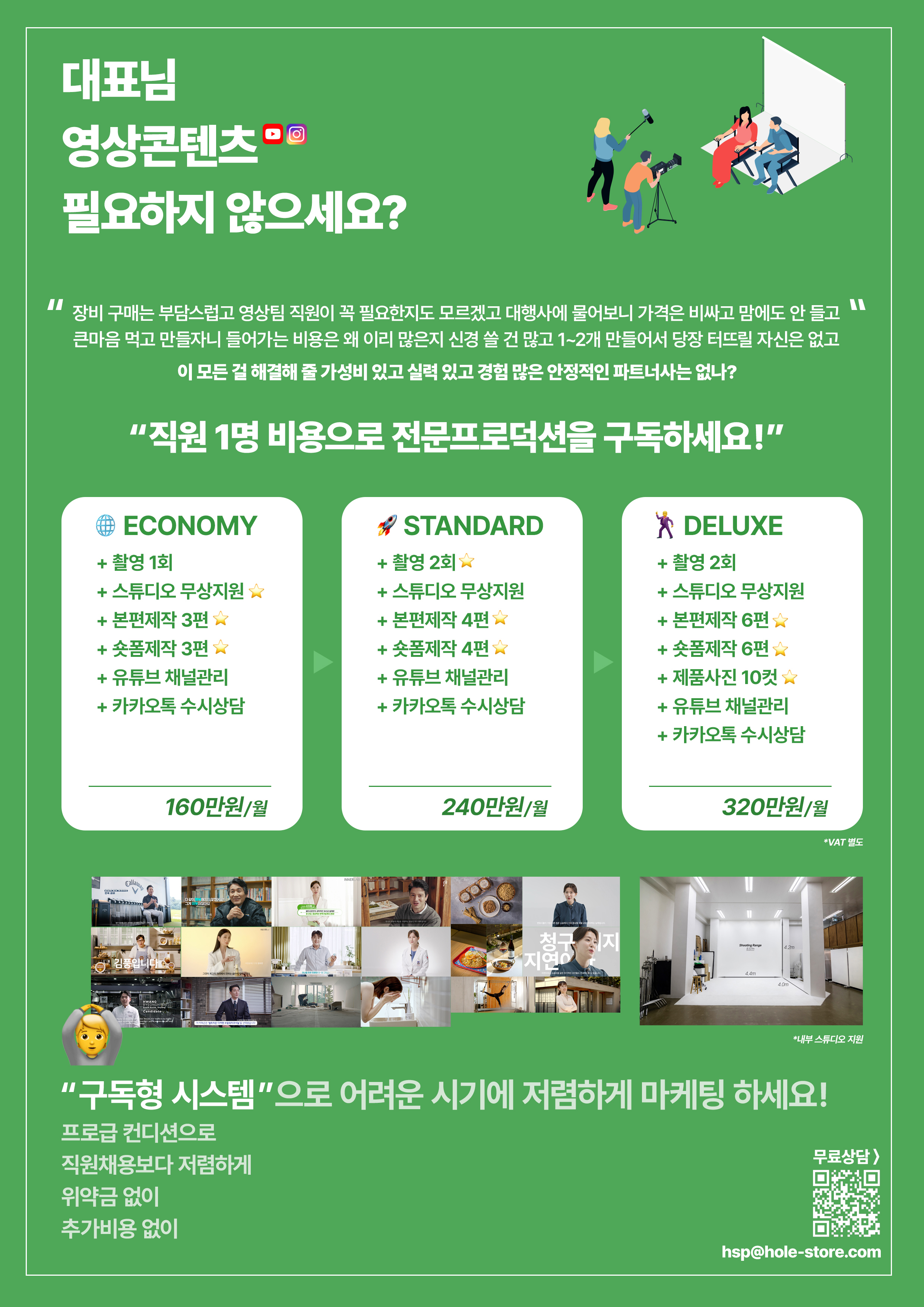 저희 홀스토어에서 직원 1명 비용보다 저렴하게 유튜브 구독형 시스템을 런칭합니다. 다양한 고객층을 흡수하기 위해 이코노미, 스탠다드, 디럭스로 선택하실 수 있게 준비했습니다. 프로급 컨디션으로 직원채용보다 저렴한데 이용 안 할 이유가 없겠죠? 약정이 없어서 마음에 안 드시면 위약금도 없고 추가적으로 발생하는 비용 절대 없습니다.
